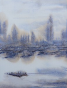 Misty scene from the Thames towards The Palace of Westminster in London. Painted wet-in-wet.