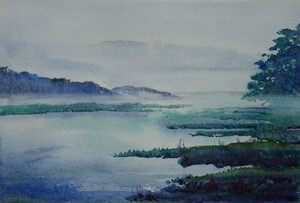Misty scene by the river. Inspired by a watercolour by Naomi Tydeman -  a Welsh watwercolourist. Small tonal study.